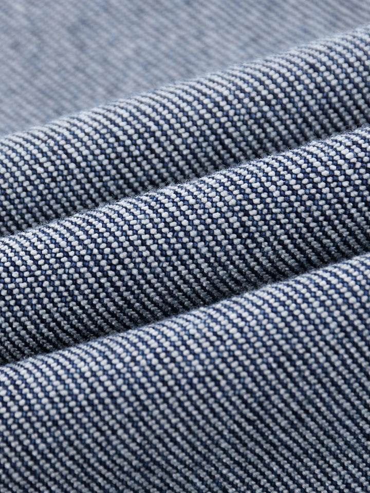 Heavy denim washed with sun-fade streaks and finished with a curved hem.