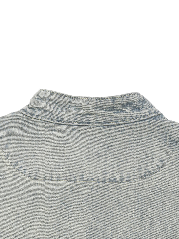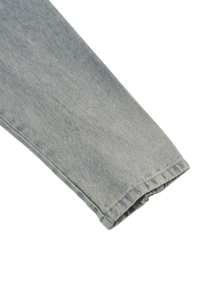 Washed denim cut oversized with a stand collar, clean zip front, and zippered cuffs.